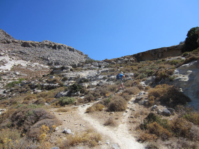 De route voert over ruige, droge berghellingen. Van een afstand ziet het gebergte eruit als een kale rots, maar tijdens de wandeling blijkt dit toch anders te zijn. |