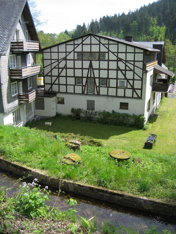 Veel huizen hebben houtrasters met witte kalk ertussen. De dorpen zien er allemaal even vriendelijk uit. Helaas is het restaurant gesloten dus moeten we zonder koffie verder op pad. |