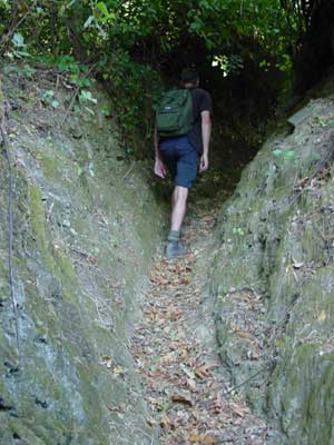 de weg af omhoog leidt. We volgen dit ruige pad tot het eindigt op een