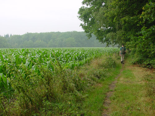 maisvelden en weilanden verspreid in het landschap vormen de komende kilometers